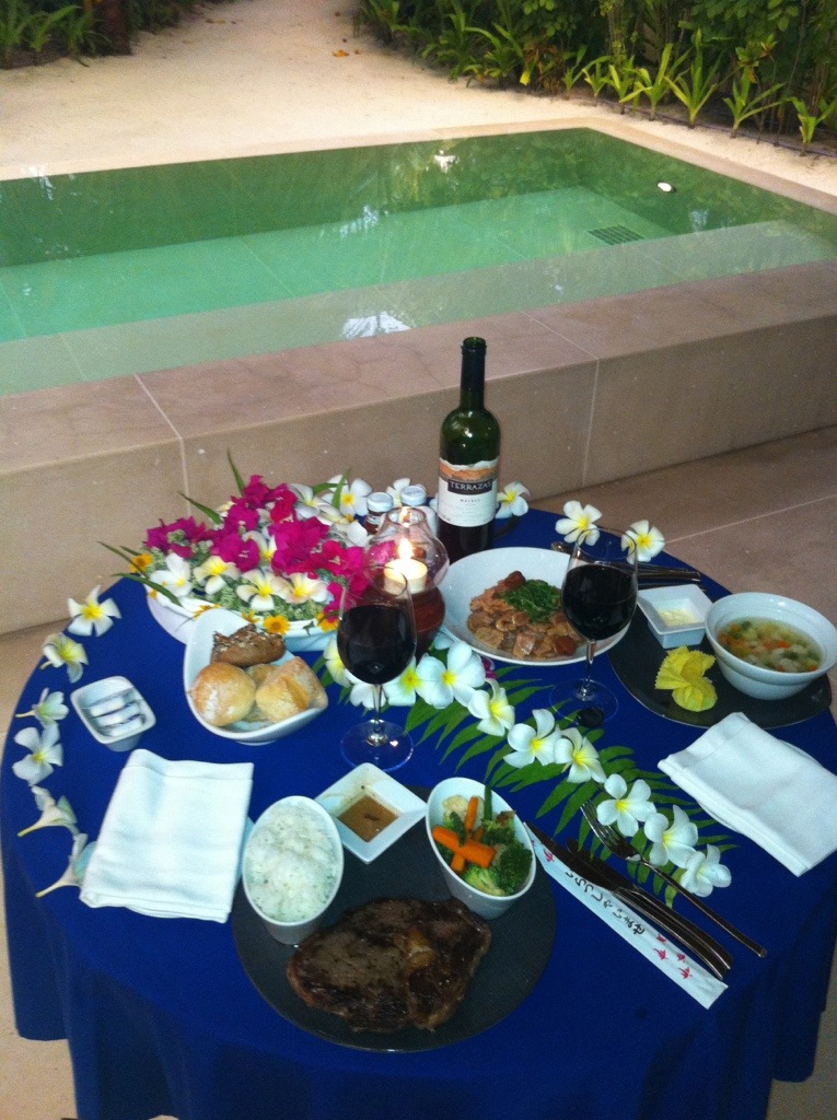 One night was a special occasion for us, and we opted to have in-villa dining. Well, was this a treat….the table on the villa deck overlooking the sea was set up beautifully with flowers and white tablecloths/napkins, wine glasses and a complimentary bottle of NZ red. The food was more than ample and delicious.