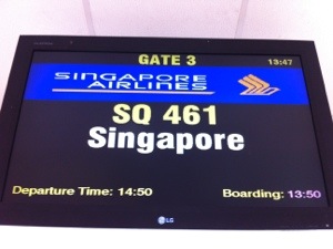 Seat 44C – economy. On time departure at 2.50pm but delayed upon arrival by 10 mins. We started off with Singapore Sling, sat back and dozed off to the quiet hum of the engines. During meal service later in the flight, our ‘Singapore Girl’ was a bit clumsy; perhaps she was new? I thought she was going to spill my glass of red on me as she leaned over. ‘Oops’, she said, with a wide grin and a wink. My meal was a special order ‘Seafood Meal’ consisting of an entree of seared shrimp, followed by a main of Poached Salmon – delicious.