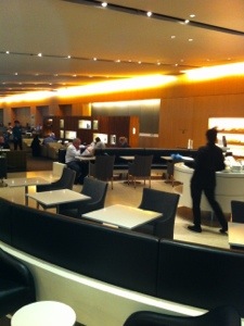 Slightly sterile lounge, but an interesting selection of food. Pizza and pasta, dips, cheese and crackers, an ice-cream self-service bar (Hokey Pokey and After-Dinner Mint!), and the usual array of Australian red, white, and sparkling wine. Surprisingly crowded, we managed to find two seats at the far side of the lounge. Wireless access is strong, and easy to connect to. A window view into the First Class lounge – where supposedly real luxury awaits. I haven’t had the pleasure…yet.
