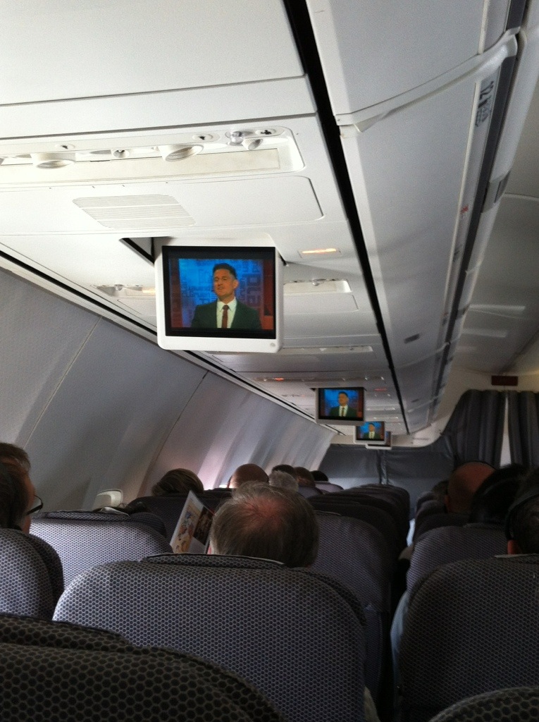 This Boeing 737-800 aircraft does not have individual entertainment screens so there is not much to do to entertain oneself. Every 6 rows or so there is an automatic fold down tiny video screen that is currently showing a National Nine News broadcast and other selected offerings.