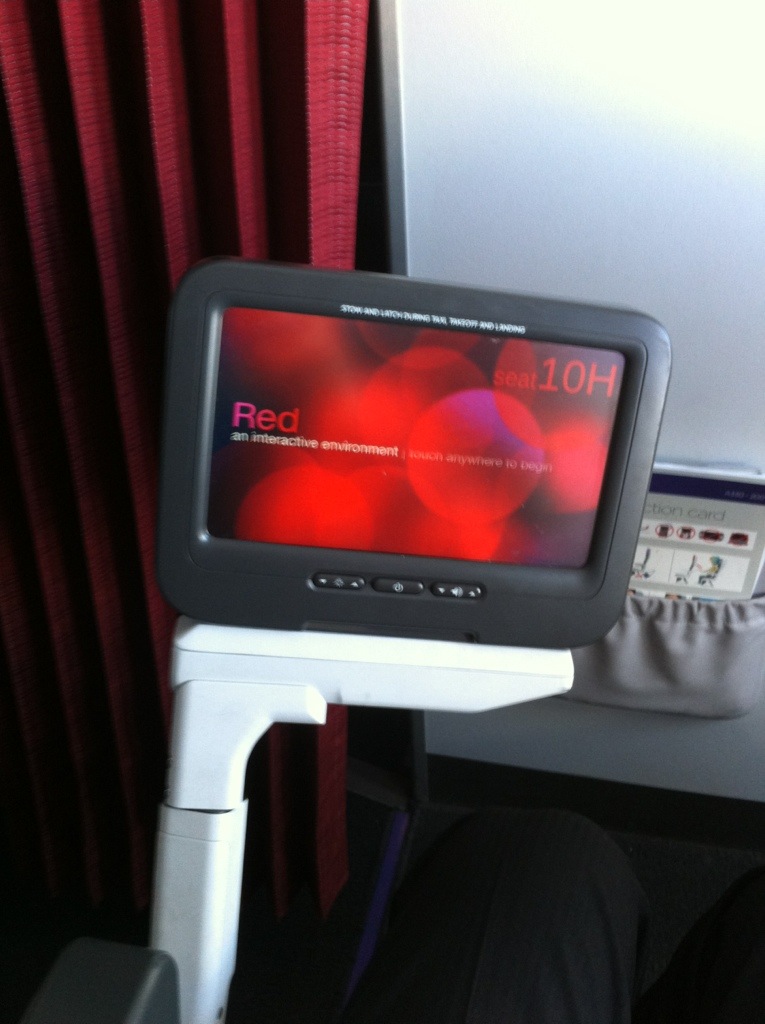 Flight DJ555 from Sydney to Perth is delayed by approximately 35 mins, due to, we are assured, Sydney Airport Authority only opening one runway. Not to worry, before long we are up in the air, with our ‘Red’ interactive multimedia personal screens on.