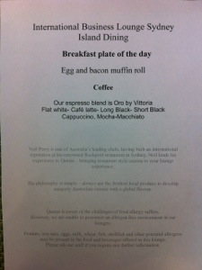 I decide to sit at the counter bar instead of the buffet today and opt for the Neil Perry ‘Chefs’ special plate, described deliciously as a freshly prepared Bacon and Egg muffin. It turns out to be an unwrapped McMuffin from MacDonalds (or at least it looks like one). But – looks can be deceiving. It tastes delicious.