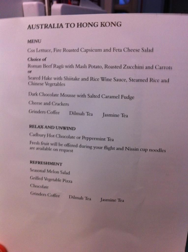 Unfortunately thing turn sour a couple of hours later – one female flight attendant seems to have chip on her shoulder and doesn’t seem to want to be flying today. No smile, stiff service, she ruins the atmosphere. Also no cup noodles – apparently anywhere on the plane. I am told as this is the ‘SYD – HK’ leg, I need to get in quick. There is also a mountain of rubbish on the tray table next to me. I am not sure what the flight attendants are doing but they seem too busy doing nothing in the galley to do regular rubbish checks.