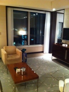 Being recognized as a Diamond HHonors member, we are upgraded to a 2 room luxury king suite with 2 toilets, separate lounge room, a ‘his and hers’ basin, full sized bath, and a long double shower. Being in Japan, all the mod cons are present, from automatic toilet seats with bidet and washlets, blinds that open and close at the push of a button, bathrobes, slippers, dressing gowns, and high end toiletries.