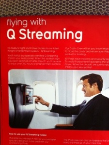 So I thought someone left their iPad in the seat pocket in front of me but on closer look it was Qantas’ new ‘Q Streaming’ iPad which I guess are taking the place of the now ‘defunct’ personal screens.