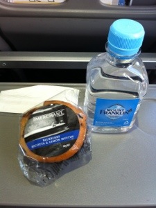 A quick snack is followed as soon as we are in the air consisting of a choice of juice or water and a Blueberry, Ricotta, and Lemon Muffin – perfect for the 40 min flight, especially after gorging myself on muesli with soy milk, brown toast with a hard boiled egg and slice of cheese, and a freshly brewed Expresso in ‘The Lounge”.