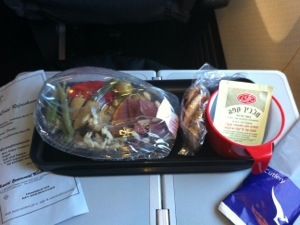 I have again ordered a Kosher meal as it is generally quite fresh, plentiful, and comes out first! And it is delicious – smoked cold meats, pickles, coffee, and cookies!