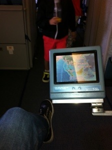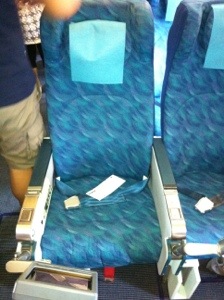 I sit back and relax prior to take off with a great view of the noisy passengers rushing past me to get to their seats.