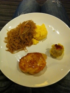 I help myself to a mixed buffet breakfast of dumplings, French toast, and scrambled eggs, which I wash down with a coffee.