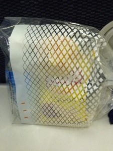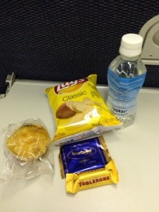 Whilst I am watching the movie the ‘meal service’ arrives – a plastic bag with potato chips, a chocolate bar, bottle of water, and a cheese muffin.