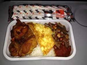 I am given a choice of 3 out of the 6 hot meals available, and choose ‘Nasi Lemak’, which, as appetizing as it looks, is not appealing having spent the last 2 hours or so being gluttonous in the Qantas Singapore Lounge.