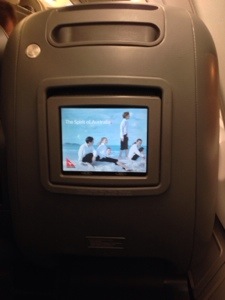 The flight is delayed for an hour due to an electrical fault, and then once we board, it is another 2 hours before supper arrives – a simple toasted chicken schnitzel and Swiss cheese toasted focaccia which incidentally has that ‘frozen’ taste like it has been heated up from the freezer.