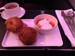 Breakfast is a haphazard choice of a cranberry muffin, fruit salad, it ham and cheese croissant. I’m hungry and ask for all 3 which is returned with an inquisitive look from the attendant. They all seem to have this ‘attitude’ chip on their shoulders and treat you as if it should be a privilege to be flying with them.
