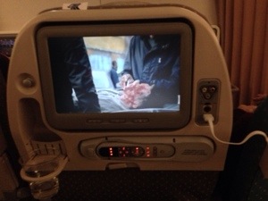 Originally I am in seat 31H – a window bulkhead seat, but behind me is a child constantly banging my seat. His father says there is nothing he can do, so I move to row 32 – and have 4 seats to myself. Yay me!