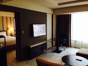 My suite is on the 22nd floor. It is a generous one bedroom with separate living room; 2 huge flat screen TVs, Espresso-type coffee machine; and all the usual amenities you would expect. I also find a mini bird cage with welcome macaroons and chocolates which is a lovely touch.