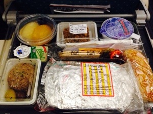 Again I have pre-ordered a Kosher meal and this time it is chicken – not salmon like I usually receive! And it is delicious. I complement this with a couple of glasses of red.