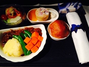 Post take-off we receive a warm moist scented towel and the menu, which is a limited choice of 5-spiced duck or lyonnaise beef – which I choose. Partner chooses Duck which is better than my choice…..