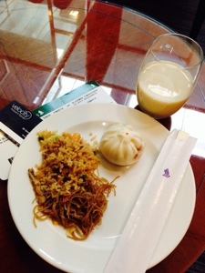 Having a quick breakfast – noodles, fried rice, and BBQ bun with Soya Milk.