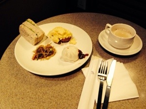 A quick pit stop for breakfast; scrambled eggs on French Toast, Asian noodles, a steamed bun, and a cafe latte.