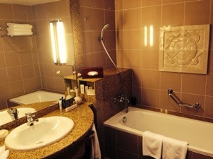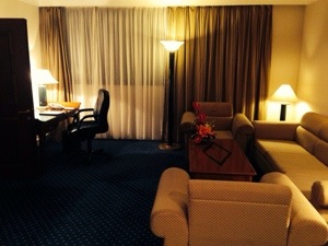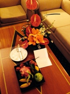 The room, although ever so slightly outdated, is large; actually 2 rooms, 2 toilets. The porter brings in the VIP fruit platter and welcome letter from the hotel manager. A nice touch.