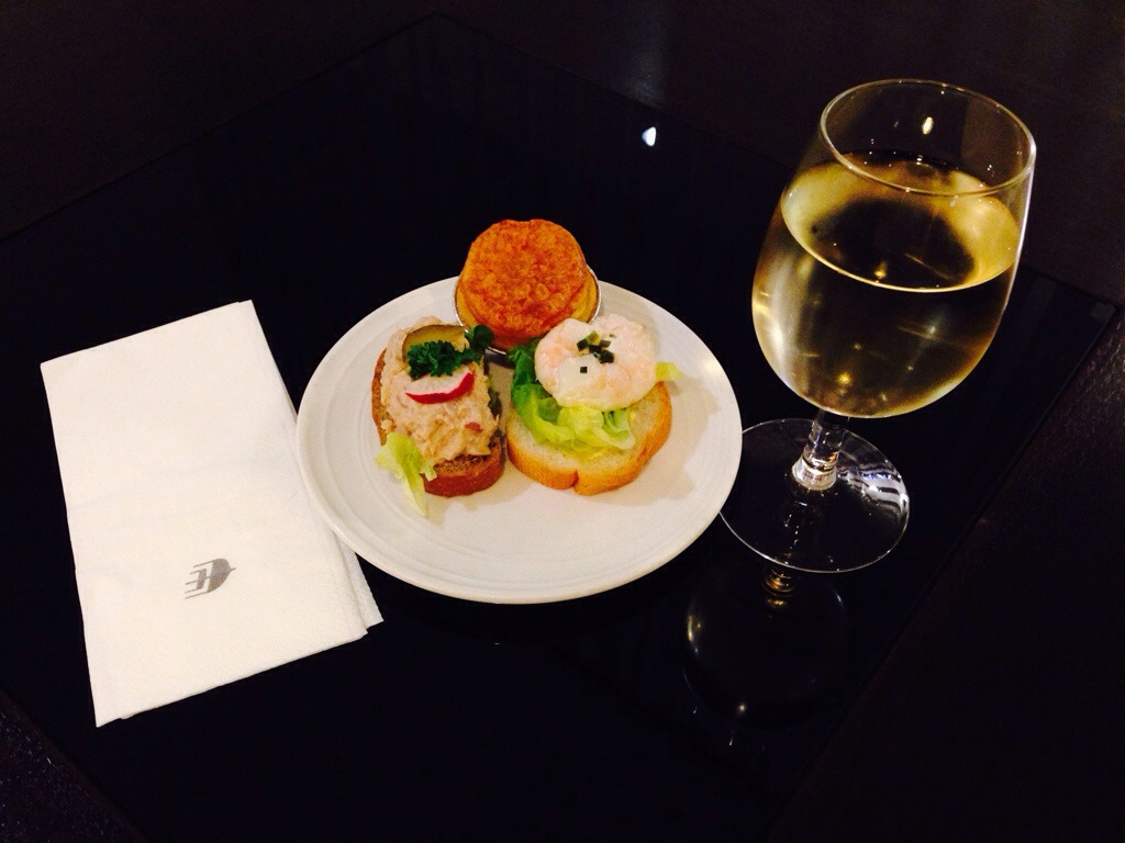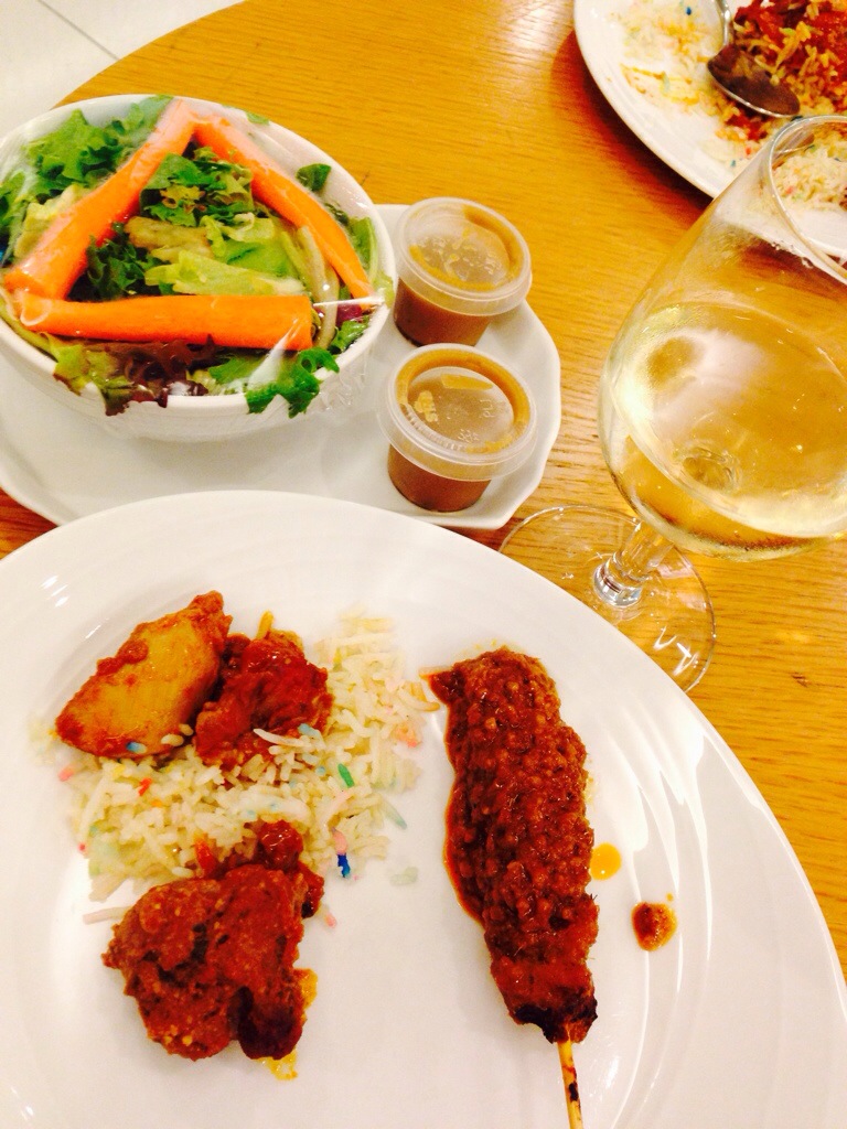 After all the crap this airline has suffered recently, my nerves are slightly on edge and I down a Sav Blanc (there doesn’t seem to be any red wine available). This goes well with some prawn and tuna canapés from the fridge. The hot food looks great – chicken satay, beef rendang etc, but the dishes are less than warm.