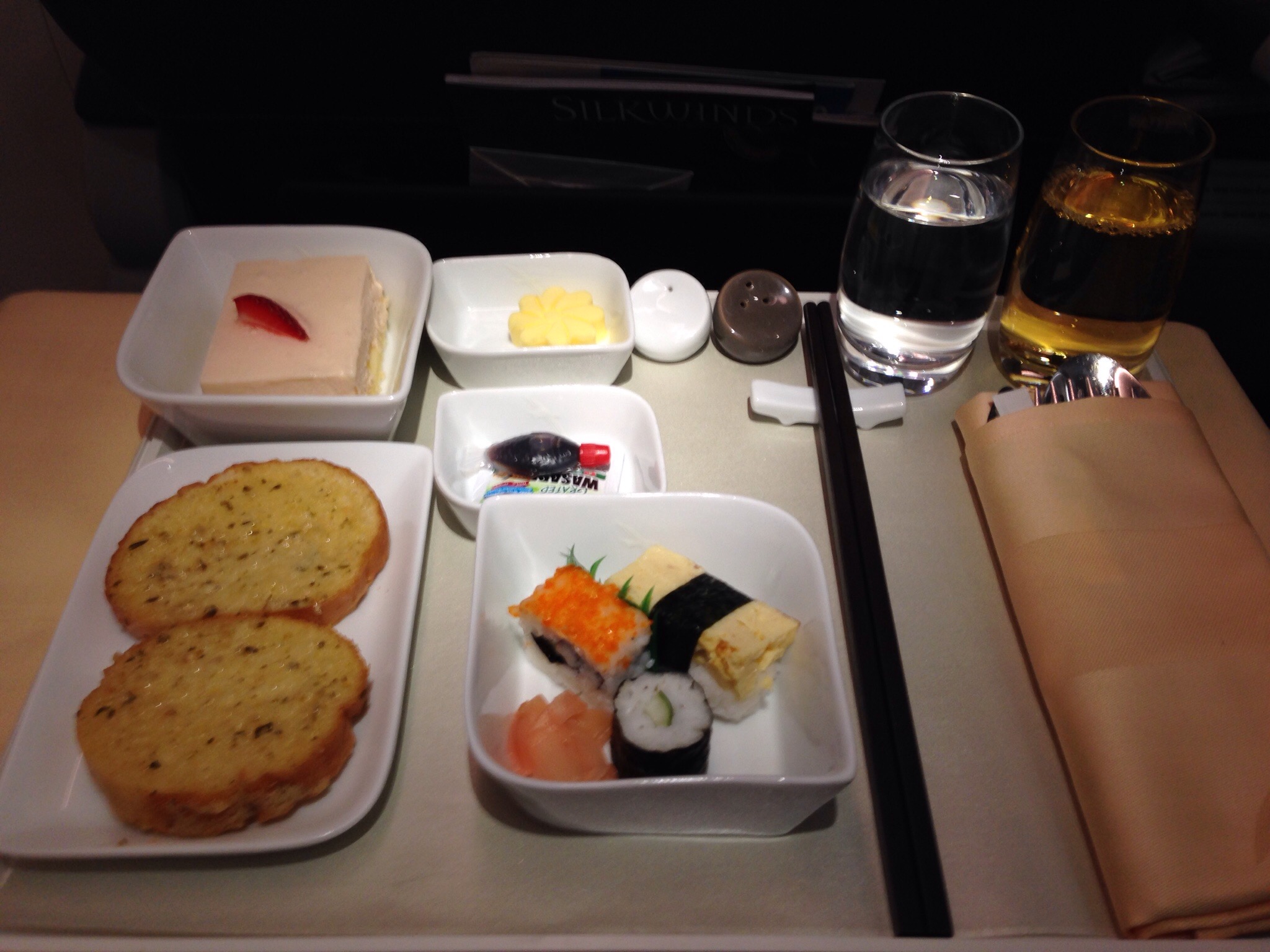 As soon as we settle in to our oversized plush leather seats, we are welcomed (again) on board and offered a choice of water of juice prior to take-off (where’s the Champagne???). We both go for water and soon a menu is handed to us to choose from either Beef Cheek or an Asian Noodle dish. We choose one of each. When it comes 30 mins into the flight, I am pleasantly surprised at how delicious it is and plentiful the servings are. I choose garlic bread from the bread basket and enjoy a glass of French red with my meal.