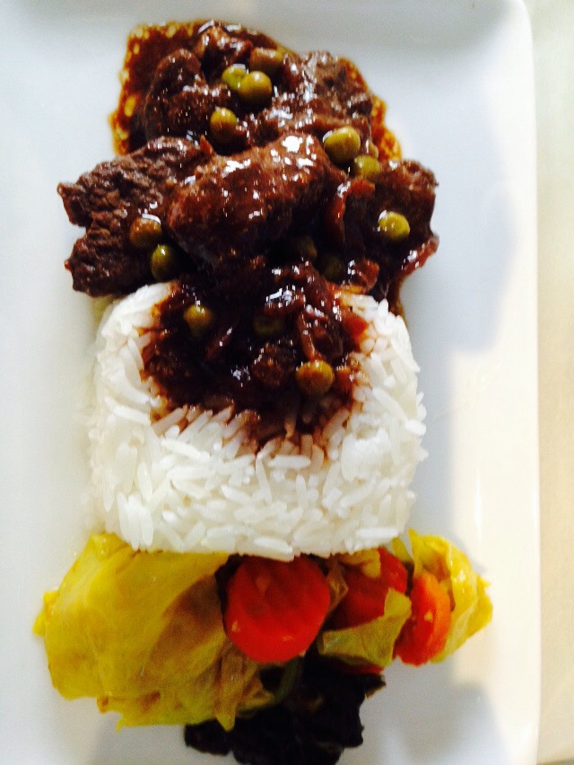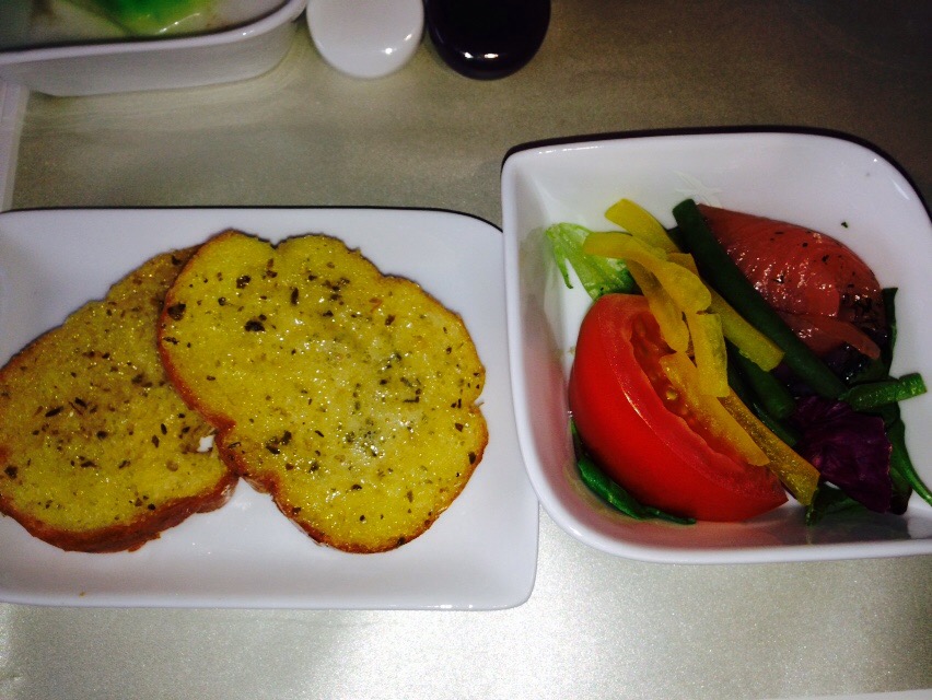 Dinner is either beef or fish so I choose beef, seasoned with a Sambal paste on rice with sautéed cabbage. Garlic bread again, which complements the smoked salmon entree nicely.