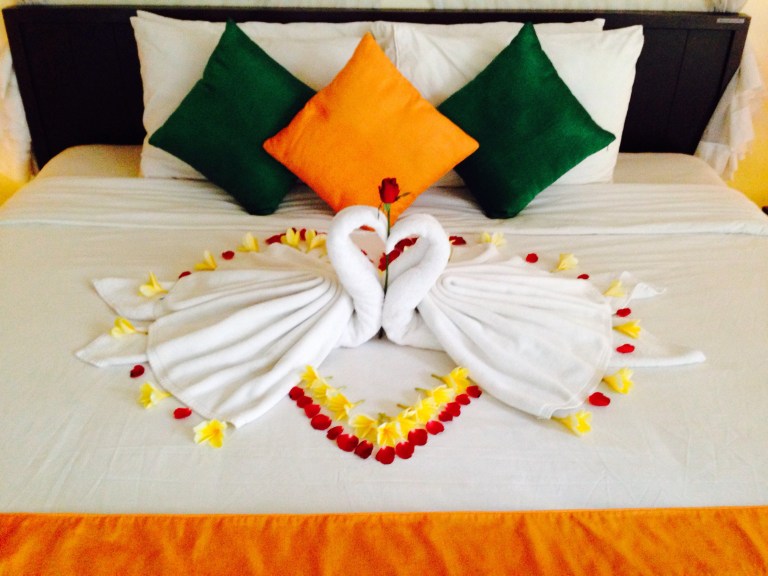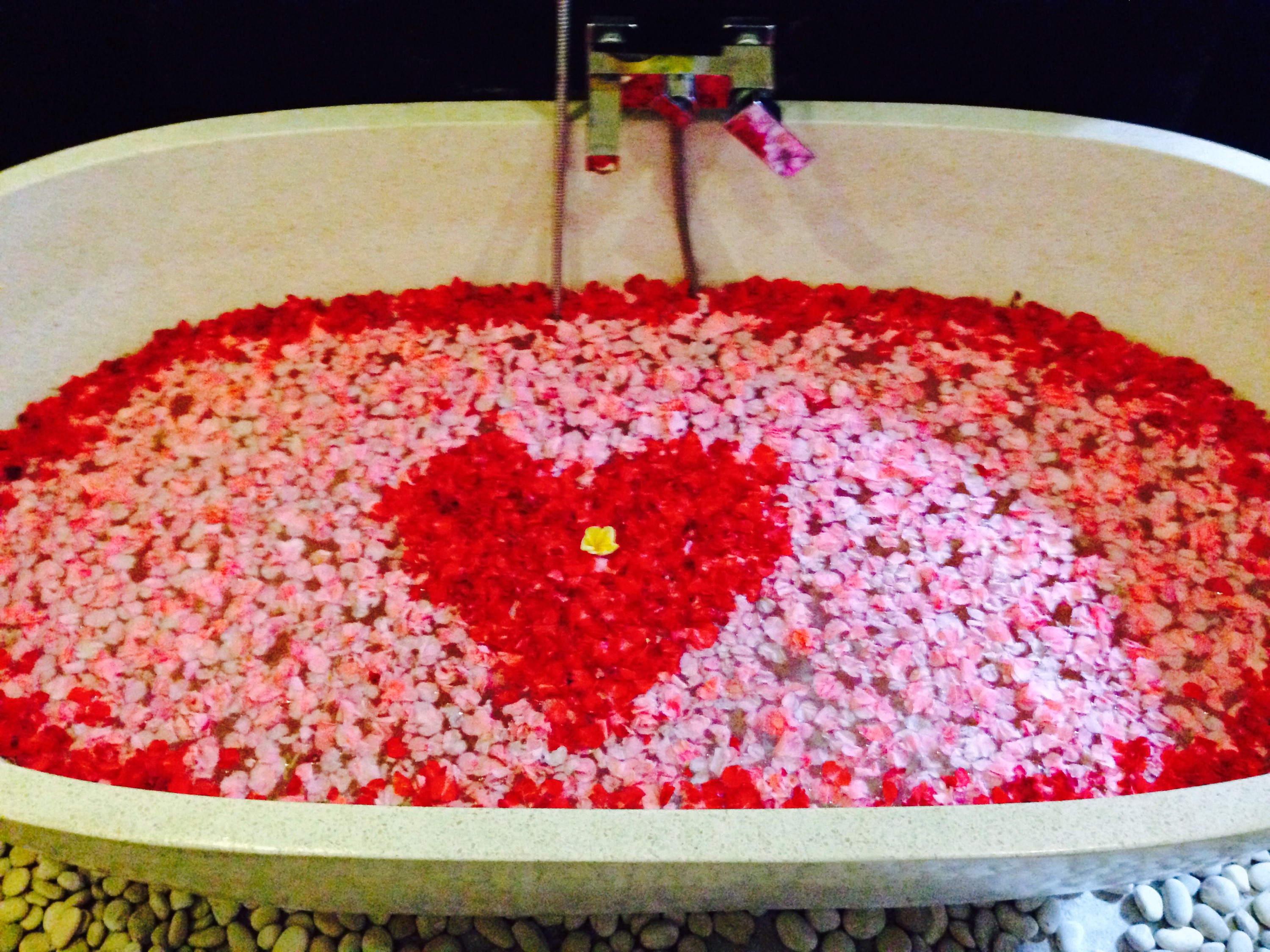 Upon returning we notice some lovely touches here include setting up the Villa for my partner’s 40th birthday. The heart-shaped rose petal arrangement, swan towels, and single red rose on the bed, along with the stunning rose-petal arrangement in the bath are a delightful surprise!