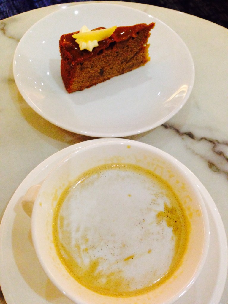 After handing over the correct collateral we find a quiet spot in the somewhat empty lounge and drop out bags before heading to the buffet. I go for the buttery mash and beef stew, a glass of Melbec, and finish off with the ‘healthy cake’ menu – a pear cake of sorts and a coffee.
