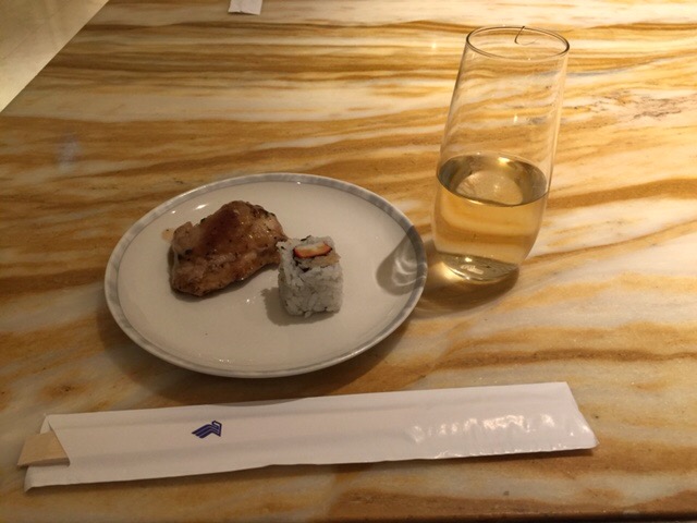 I decide to do a very quick taste test of a Munn Champage with a single piece of sushi and a sliver of Black pepper chicken. I know there is a special meal waiting for me onboard very soon.