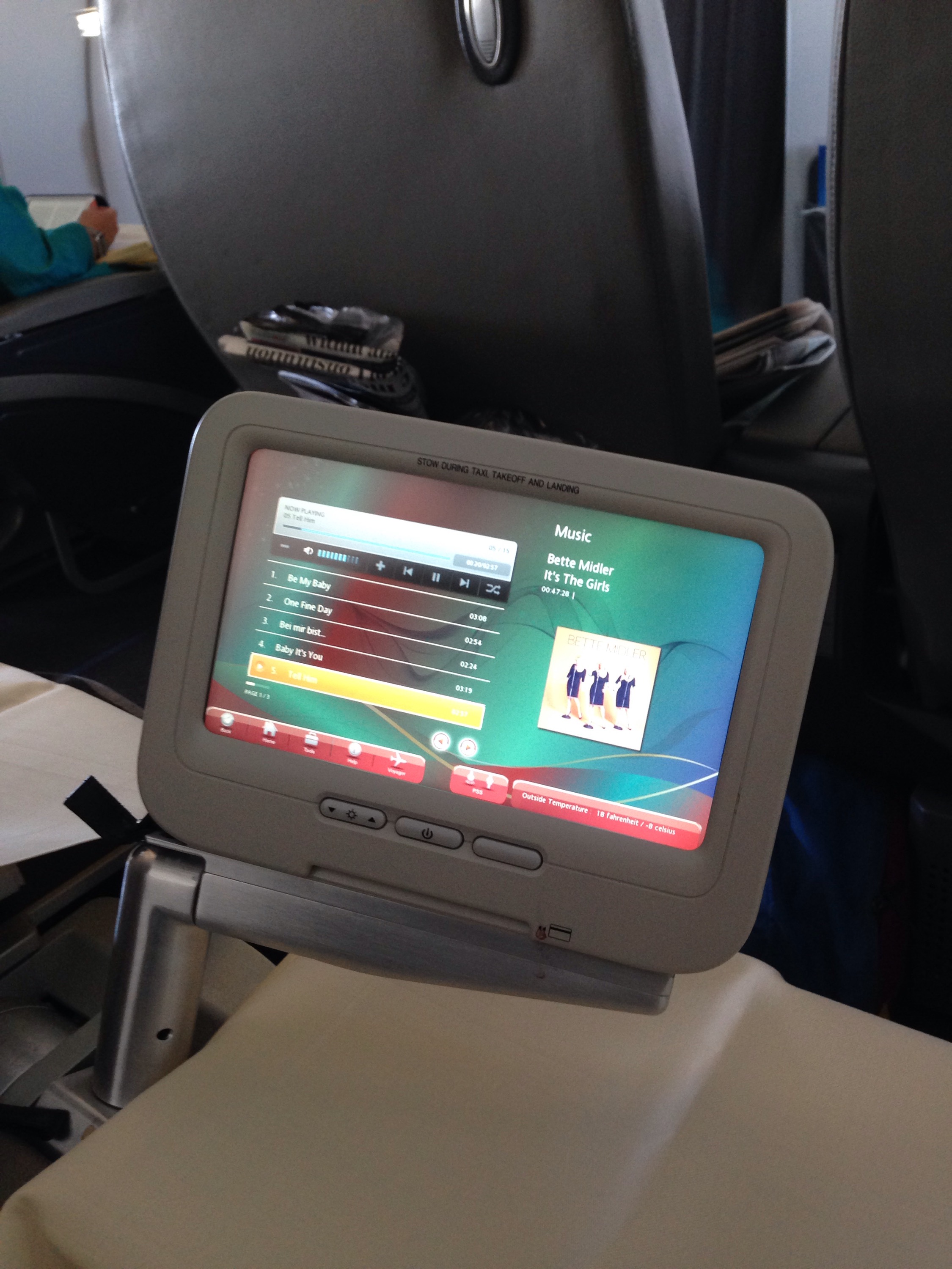 The AV selection is sparse when compared to SQ or EK but there are definitely enough choices on this reasonably short trip. I decide to watch ‘MacFarland USA’ before my nap. Before that though, whilst waiting for my brunch, I listen to the complete ‘Bette Midler – It’s the Girls’ album – brilliant!