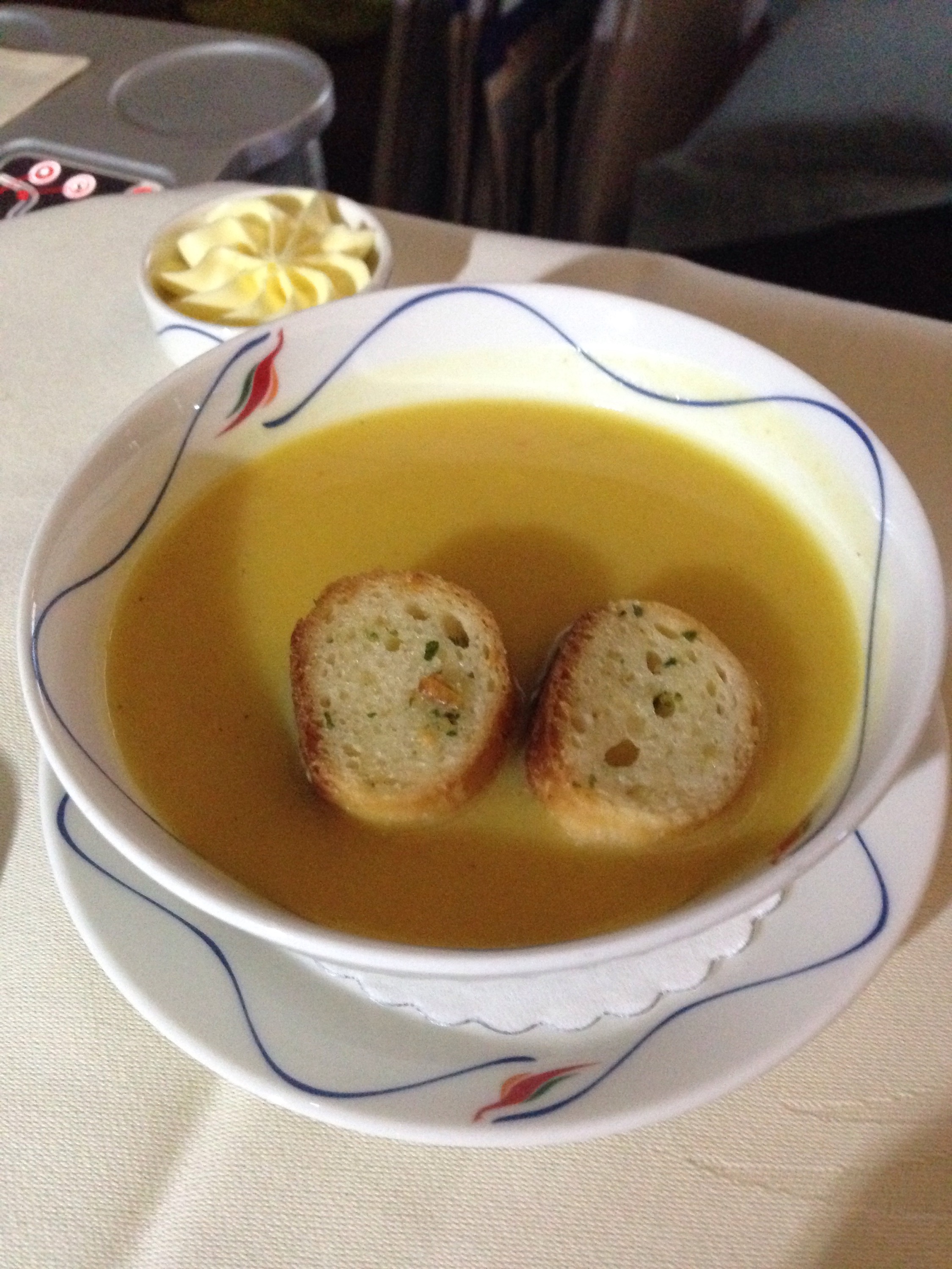 After a few hours and a comfortable sleep, the second meal service comes around and I forgot I had pre-ordered a mix grill. I’m not that hungry but manage to finish most of it. The Pumpkin soup with large garlic croutons is particularly delicious.