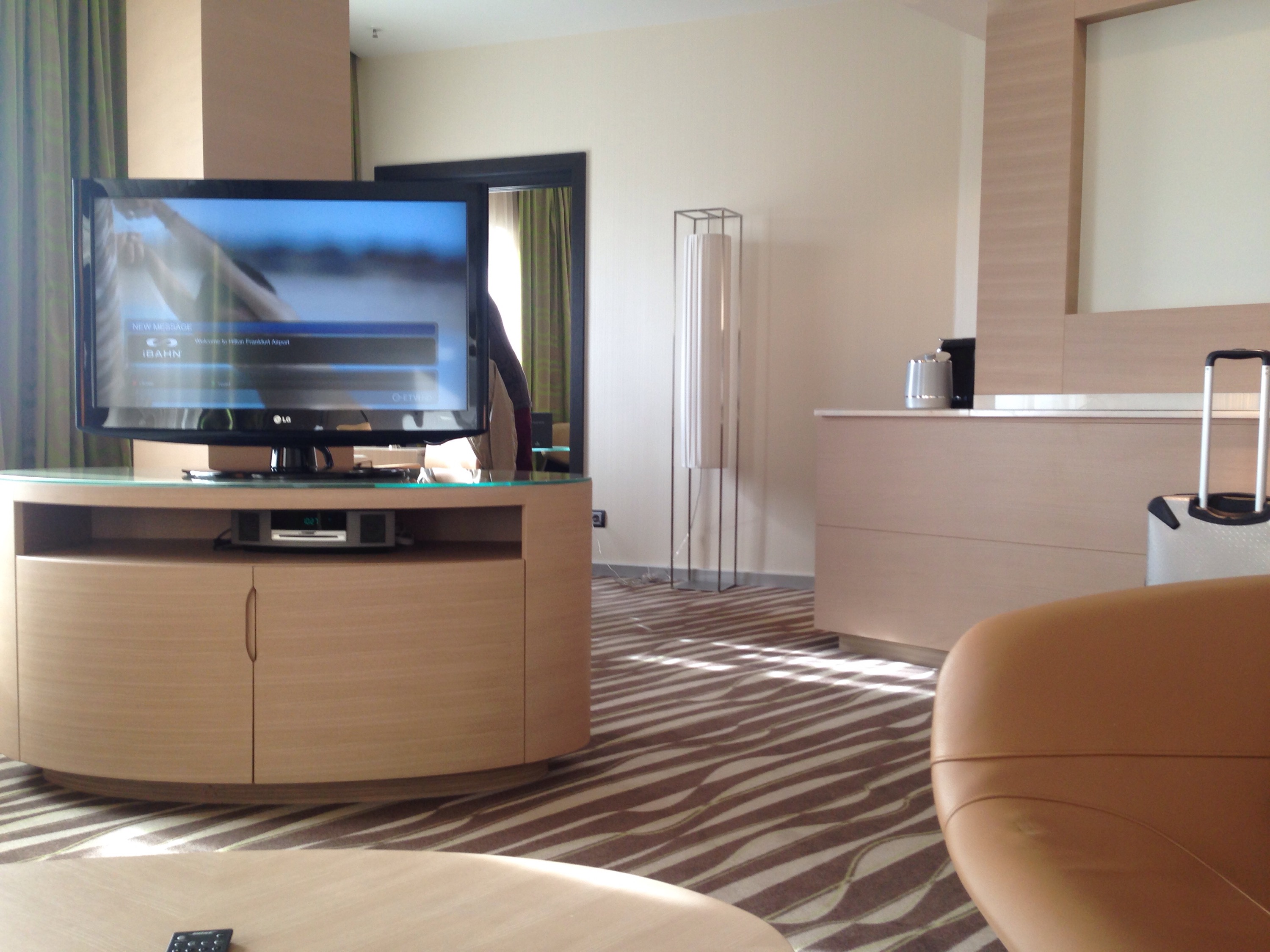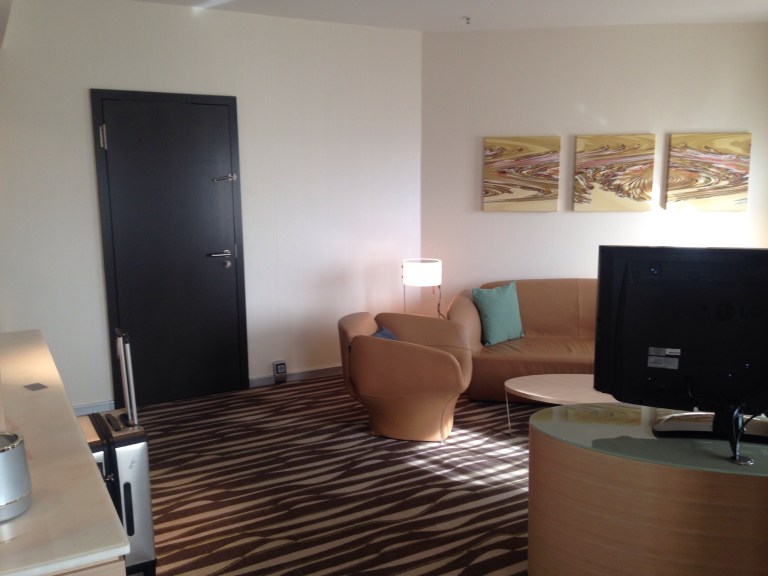 When we finally enter the suite it is large, modern and contemporary, with beige leather lounges in the separate lounge room, and another leather chair in the bedroom. The bathroom has a separate bath and shower, and is large and functional.
