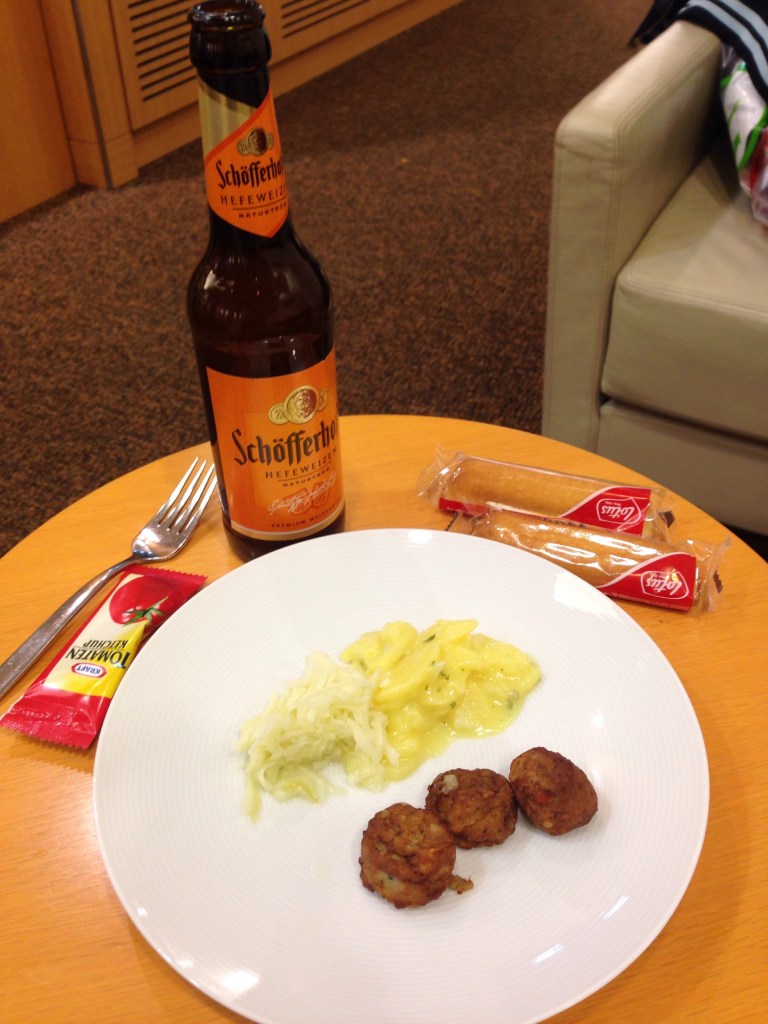Nonetheless I try the meatballs, German potato salad, and Sauerkraut, with a German beer.