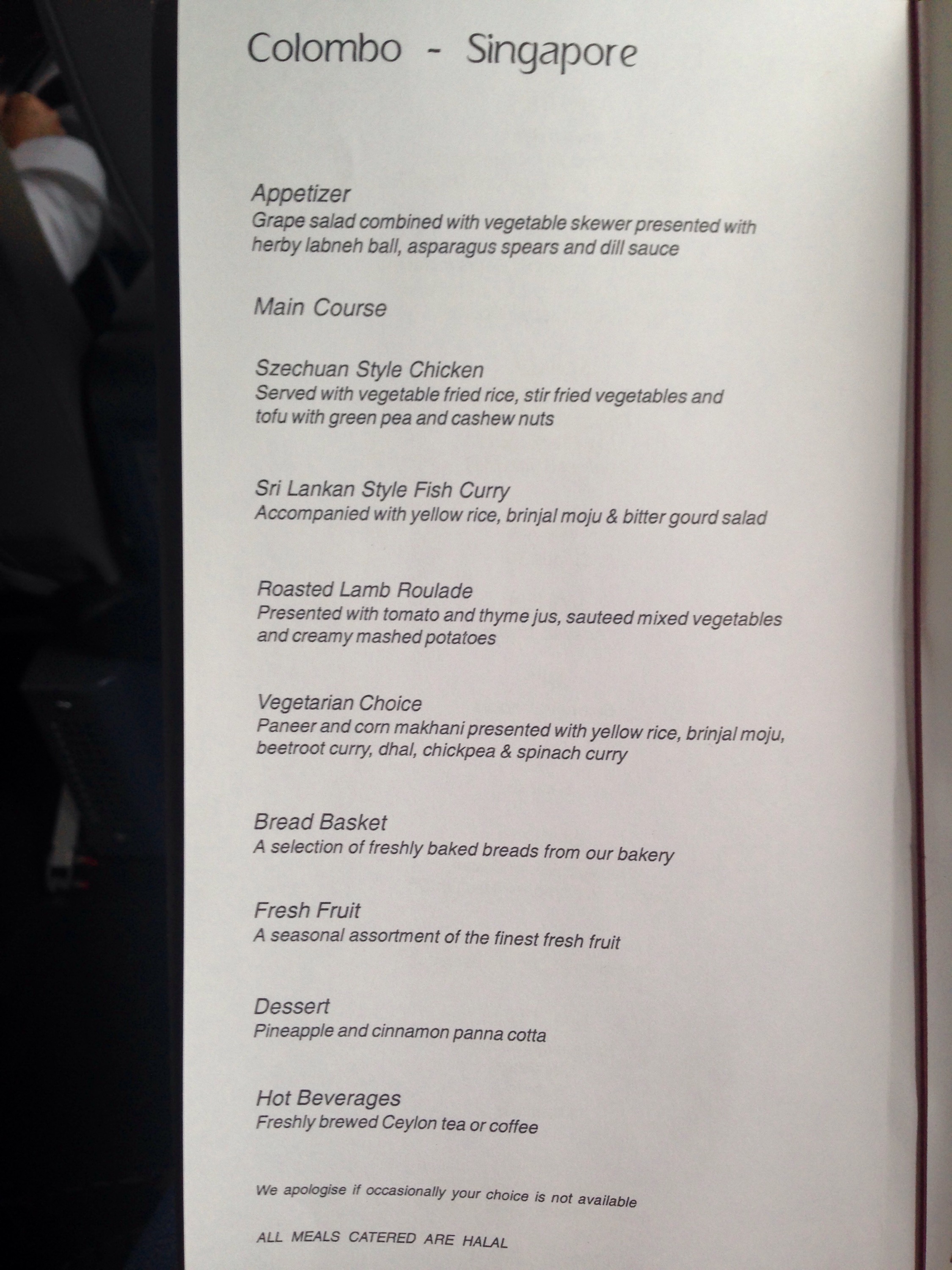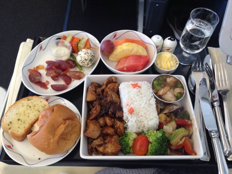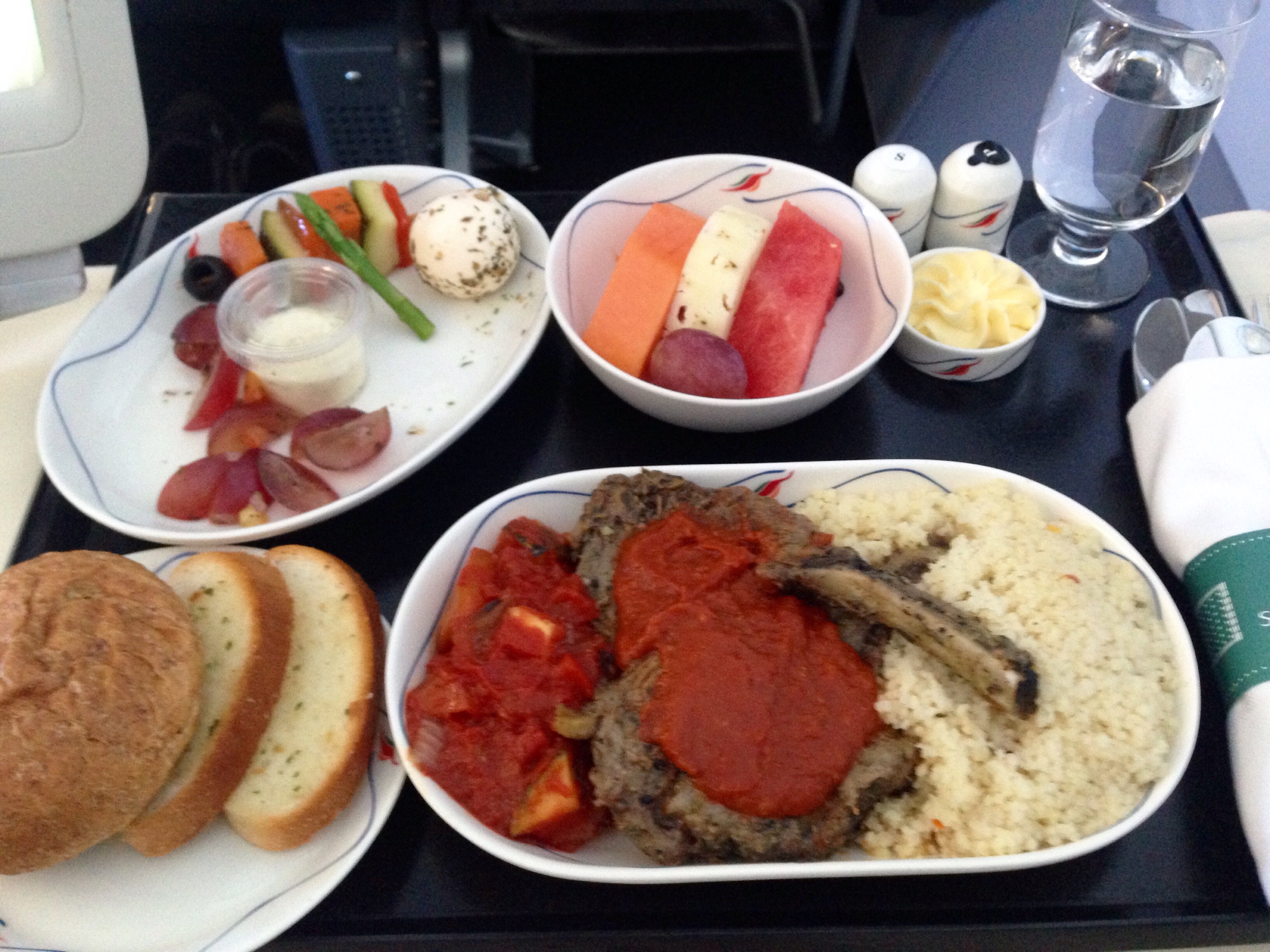 After a welcome drink and hot towel service we have our lunch orders taken but already the Roasted lamb roulade is gone (they only had 3 servings on board) so the flight attendant kindly offers me the crew lamb meal which I enjoy soon after take off and it is delicious.