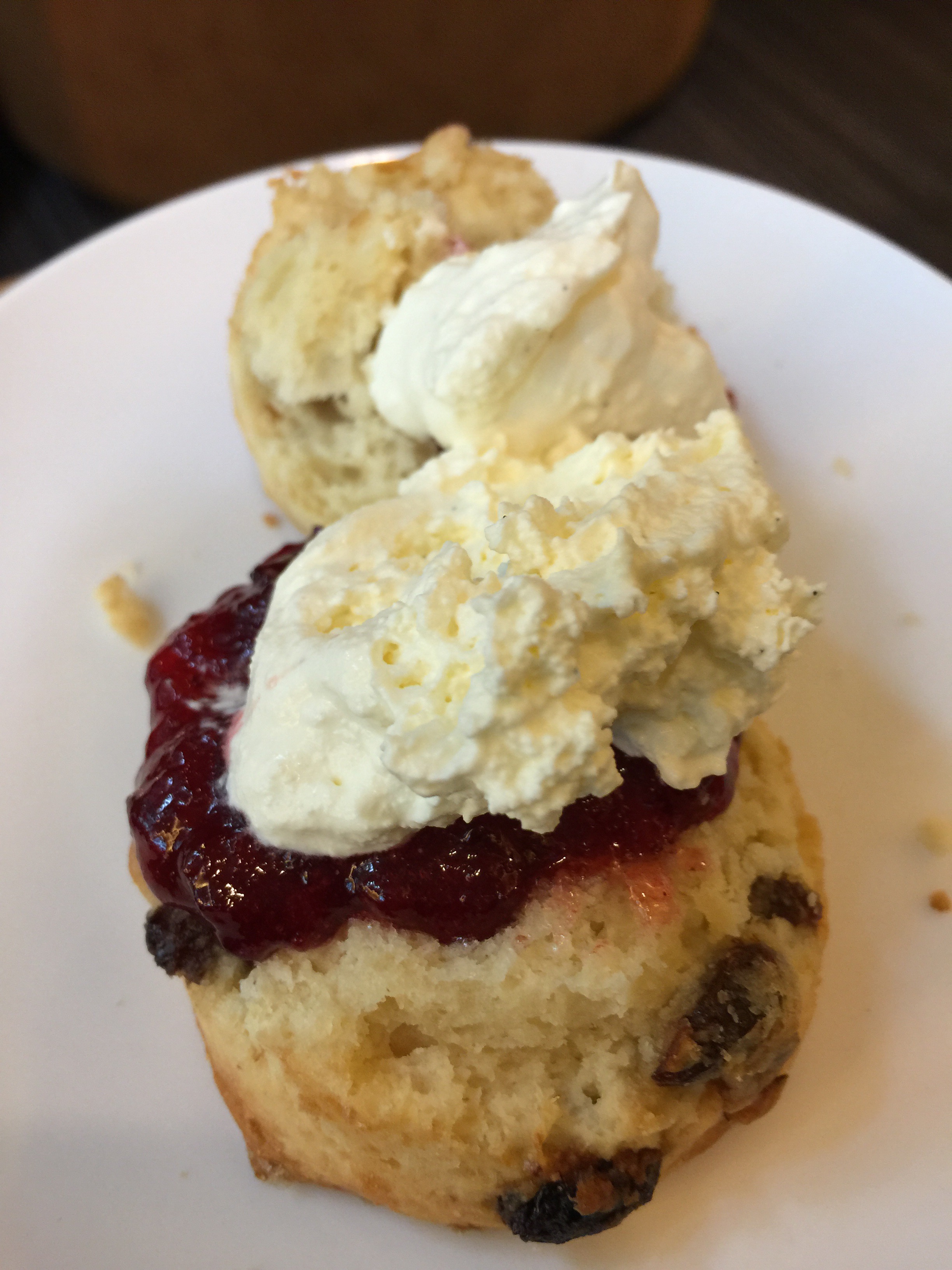 I am hungry, so make my way to the buffet where there is a delicious assortment of snacks including warm scones with strawberry jam and cream!