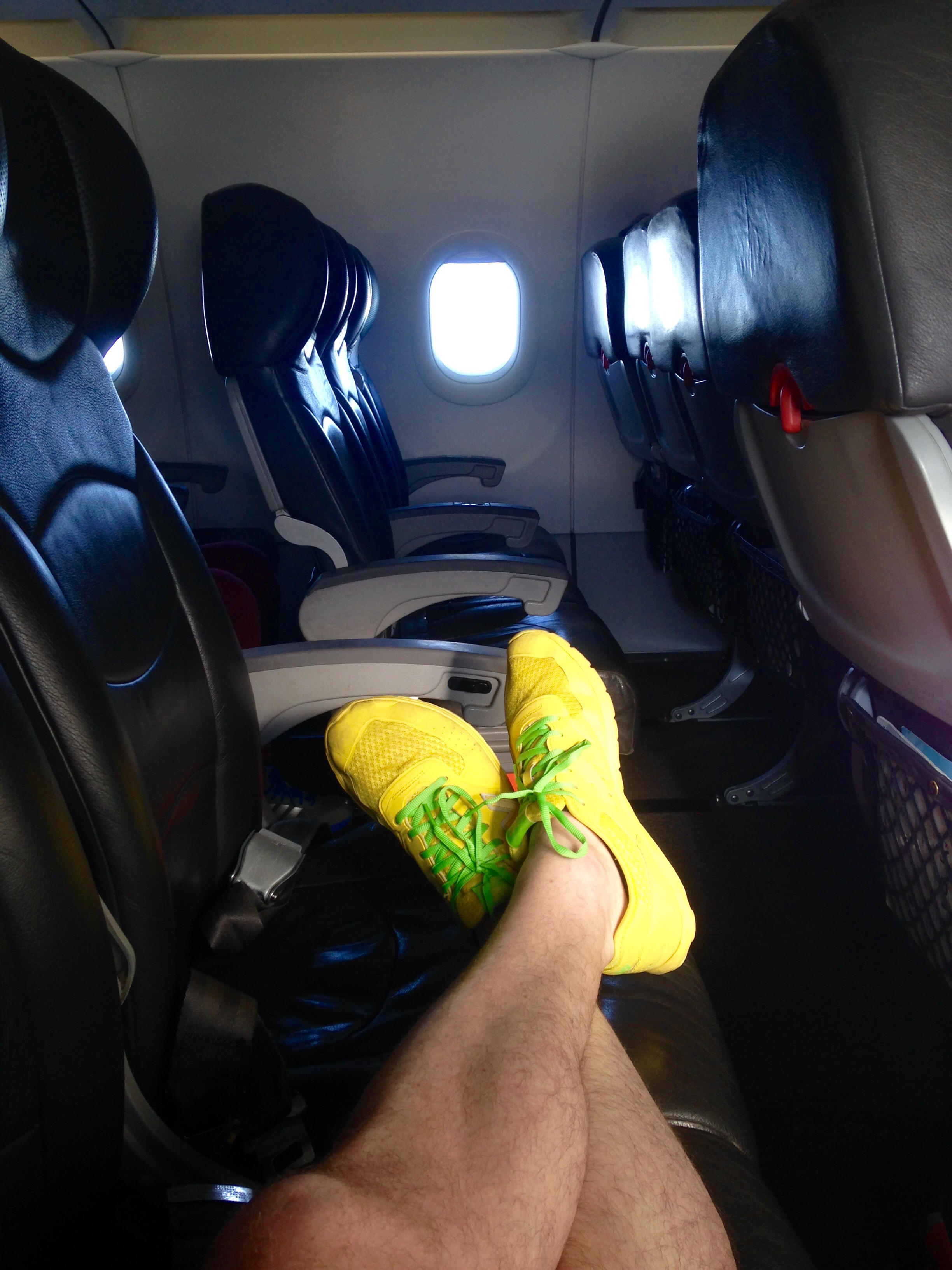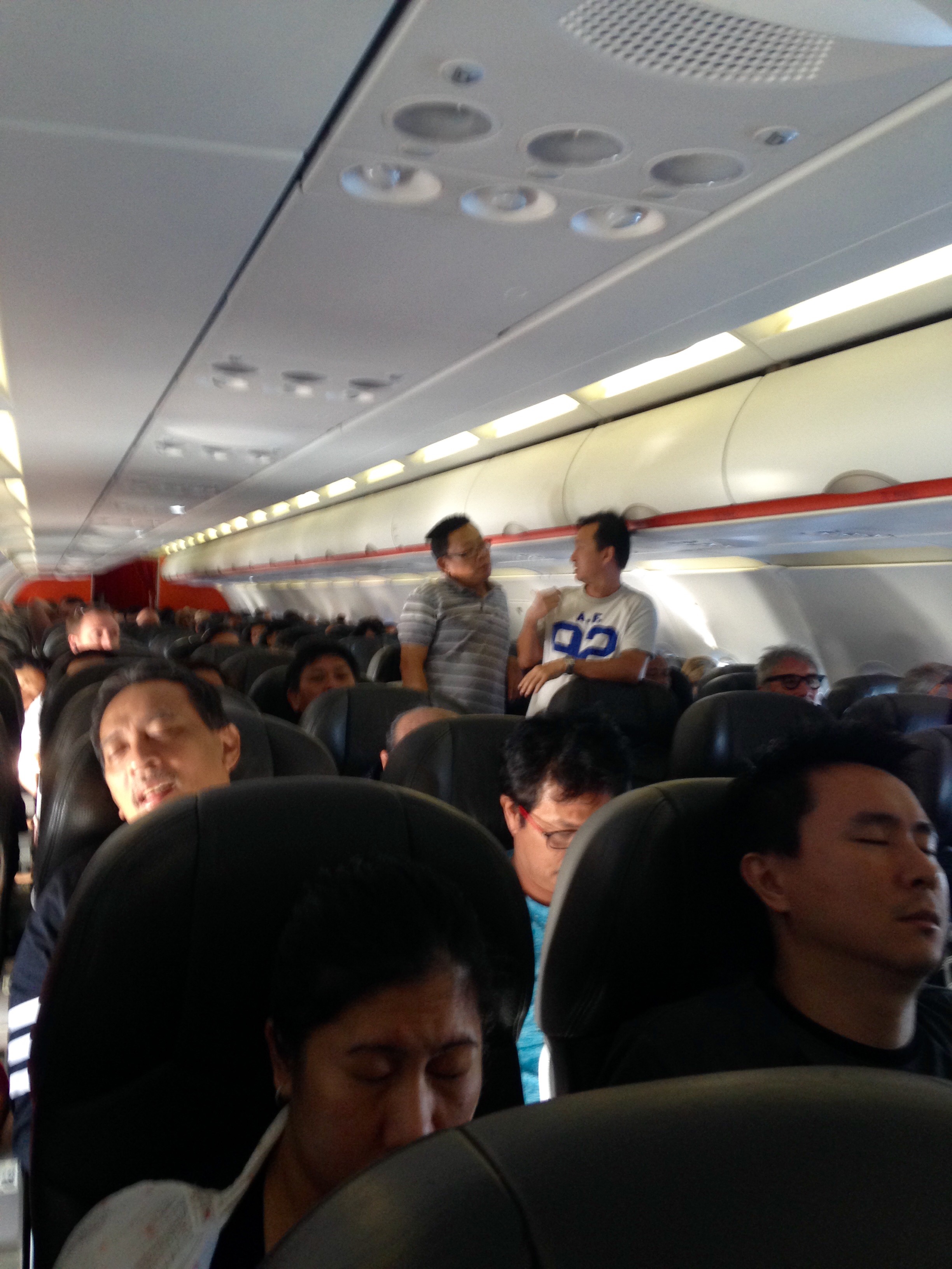 Due to some luck from some force I don’t know, the row next to me and the one behind it are vacant. So as soon as the cabin door on this JetStar A320 aircraft shuts, my parter and friend bolt out of their seats next to me and take possession of the empty rows.