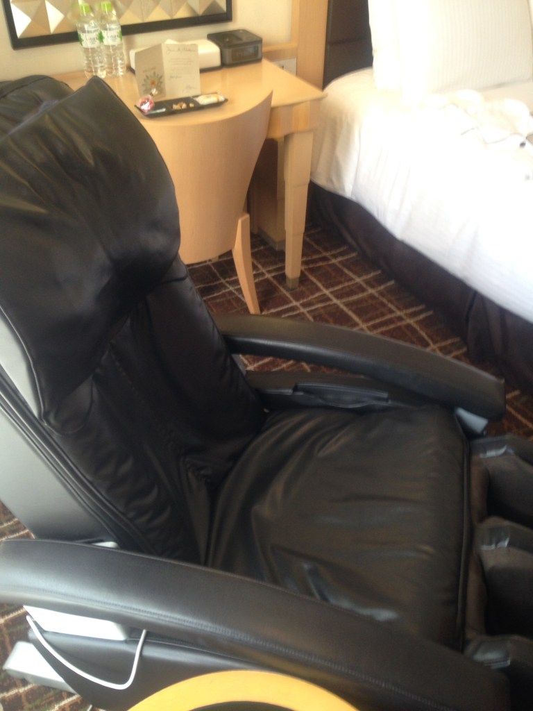 The room we receive is quite small, and consists of a Queen bed, full massage chair, and compact Japanese-style prefabricated bathroom. The view overlooks Naha Harbour.