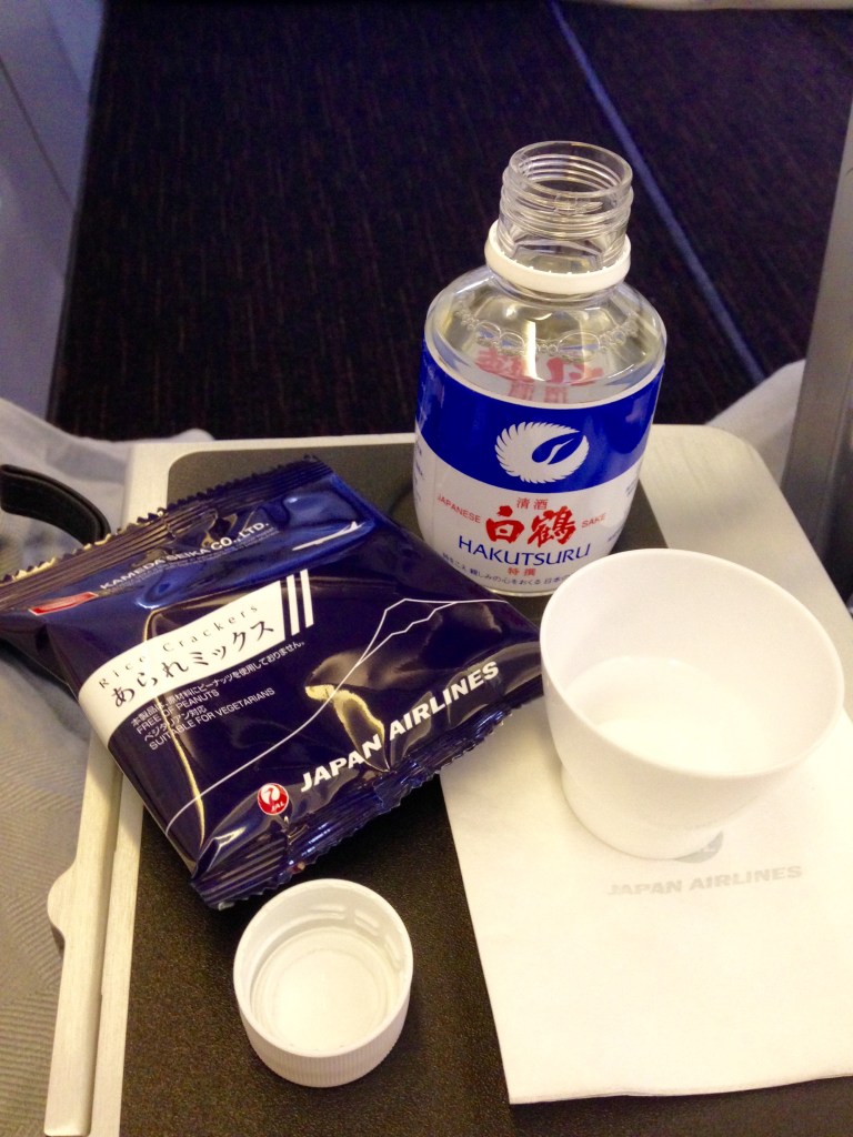 Soon after take-off the seatbelt sign switches off and a cold wet paper towel and pre-meal drink service begins. I choose a room temperature Sake from the limited drinks menu which comes with a small packet of nuts and rice crackers.
