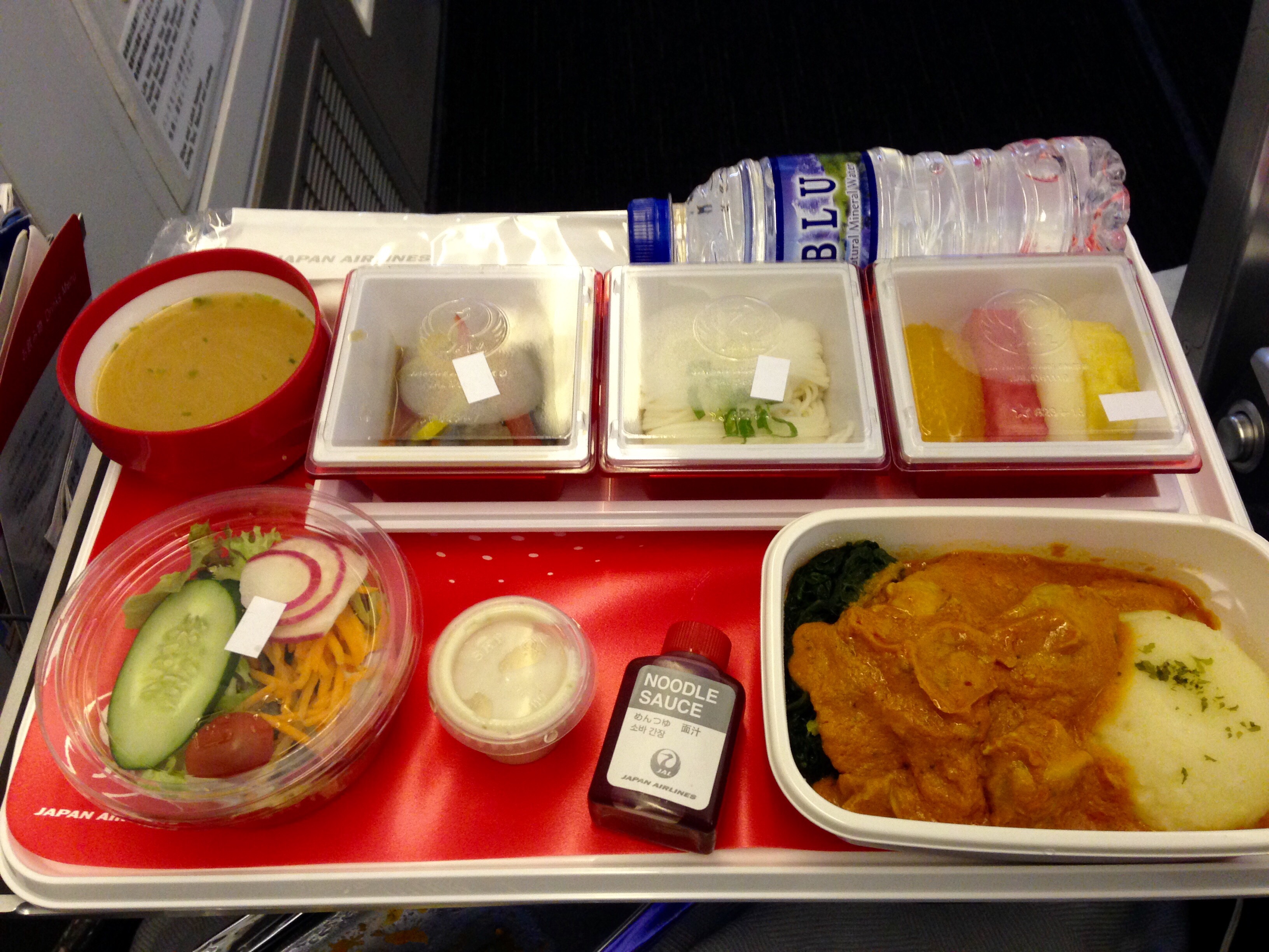 But it is the meal that is a standout. Wow – blown away…it is absolutely delicious: hot miso soup, soba noodles with sauce, a Japanese appetizer, the most delicious butter chicken I have eaten on an airplane, fresh fruit cup, and a small tub of vanilla Hagen Daaz ice cream. All washed down with a small bottle of Italian red (or was it French? Can’t quite remember…).
