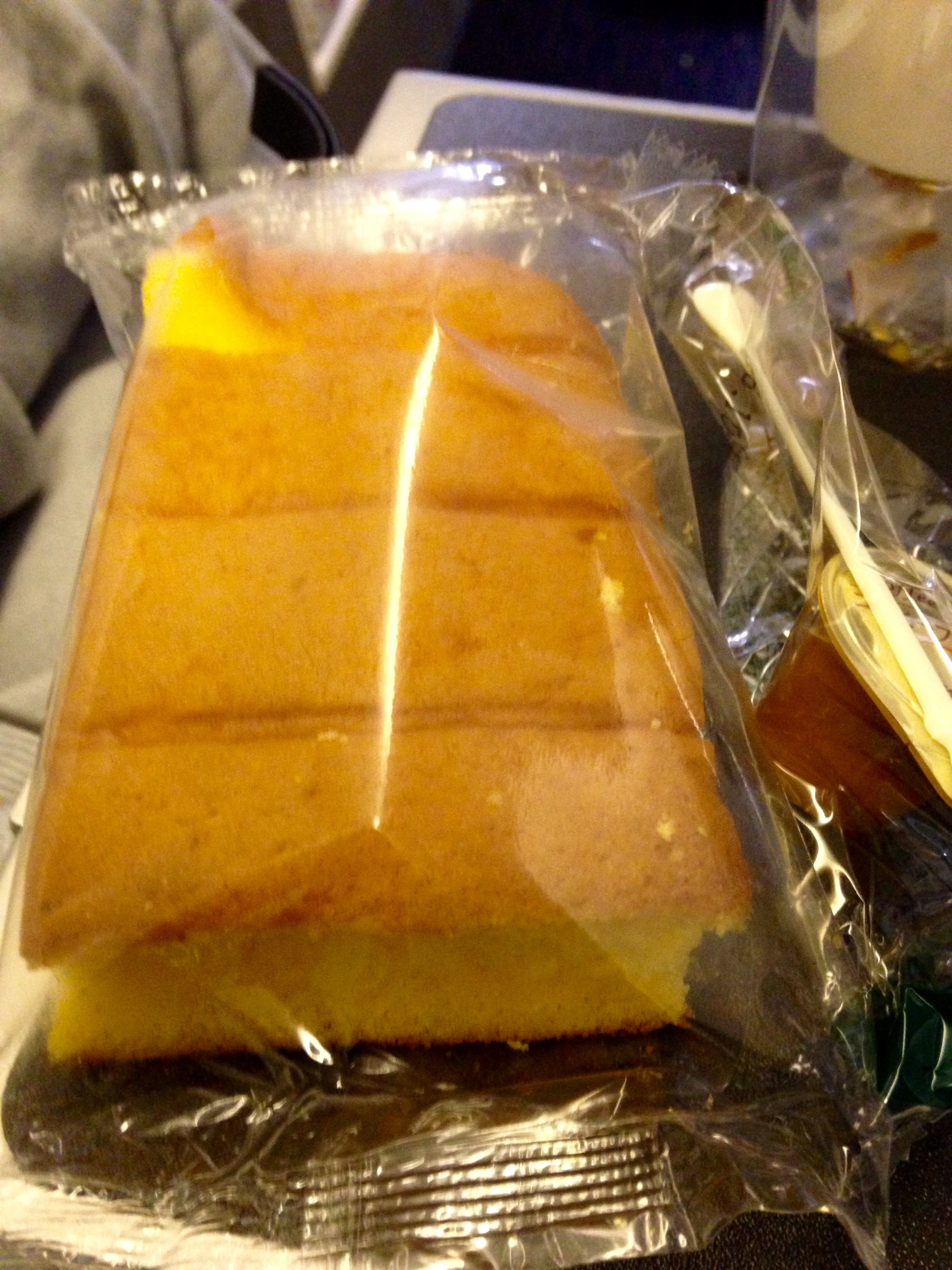 For the remainder of the flight I take turns watching movies from the limited catalogue and sleep. A small orange Chiffon cake snack and a coffee is handed out towards the end of the flight.