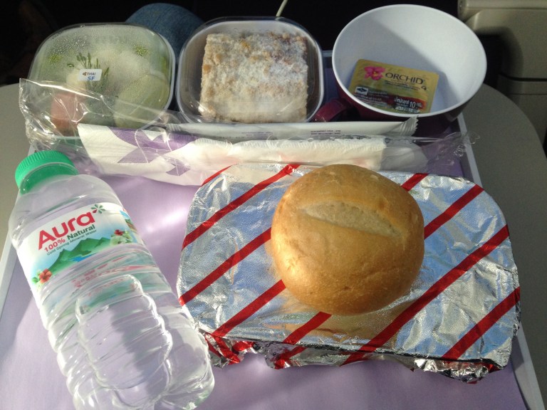 Shortly after take-off the meal service begins and I am one of the first to be served as I have pre-ordered a seafood meal. It consists of a smoked salmon and potato salad entree which goes well with my soft, warm, wholemeal bread roll, barramundi fillet in a salsa sauce with carrots, French beans, and baby potatoes, and a delectable banana crumble-type cake. A glass of red and a coffee complete this surprisingly delicious meal.