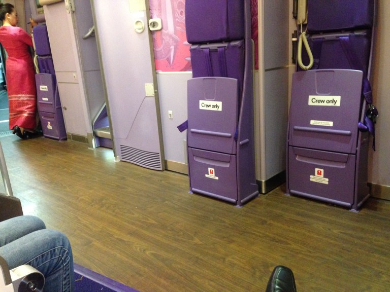 Even though I have no status (yet) with Thai Airways or Star Alliance, I am fortunate to be able to select an Emergency Exit row seat at the front of this Airbus A380 mammoth. My seat, 31K, is a window seat with nothing but space as large as my apartment in front of me. It has all the requisite sockets for charging and is quite comfortable.