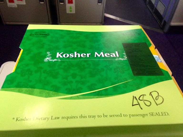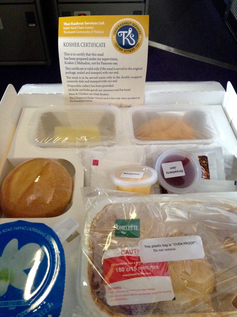 The flight is only an hour and I am expecting a small snack but as I ordered a Kosher meal for this return leg, I am blown away by my delicious full-sized meal complete with dessert. All other passengers receive a small pastry similar to what I received on the way over. It includes an omelette and sausage with a tomato meat sauce, pineapple, bread roll with condiments, and a cinnamon scroll.