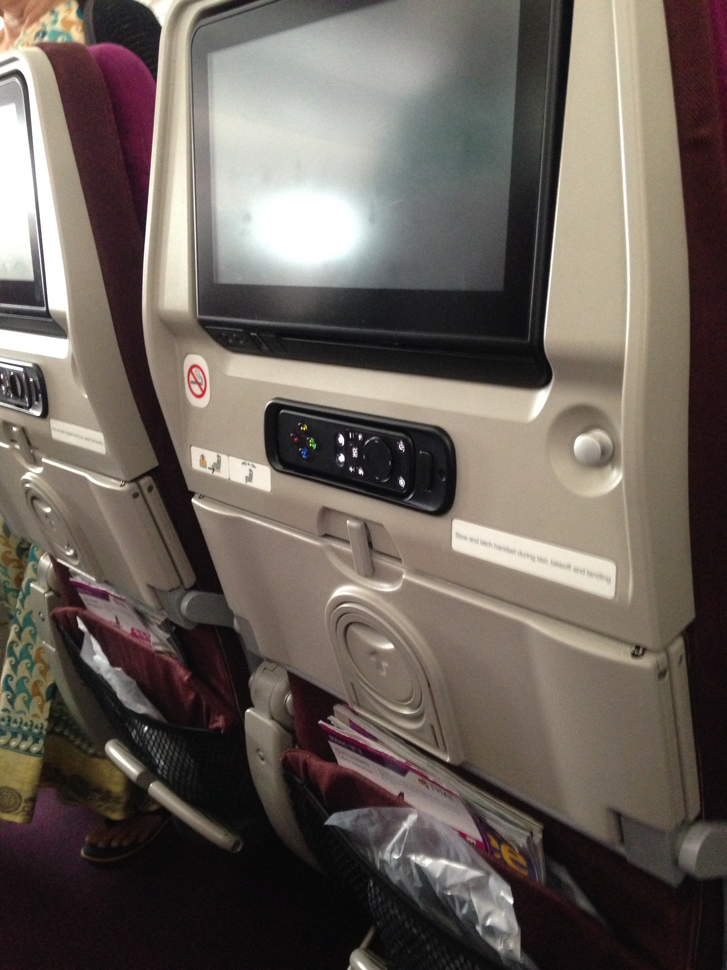 My seat is 32F, an aisle seat one row behind the start of Economy, on this Boeing 787B Dreamliner. It is very comfy, has ample netting for my bits and pieces, a large touchscreen video, and even a foot rest.