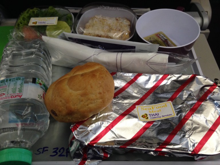 Not long after the flight begins, my pre-ordered Seafood meal comes and it is both ample and delicious. It consists of a warm multigrain roll, smoked salmon and potato salad, fish in a tomato sauce, and a vanilla crumble type dessert. This all goes down well with a couple of glasses of red wine.