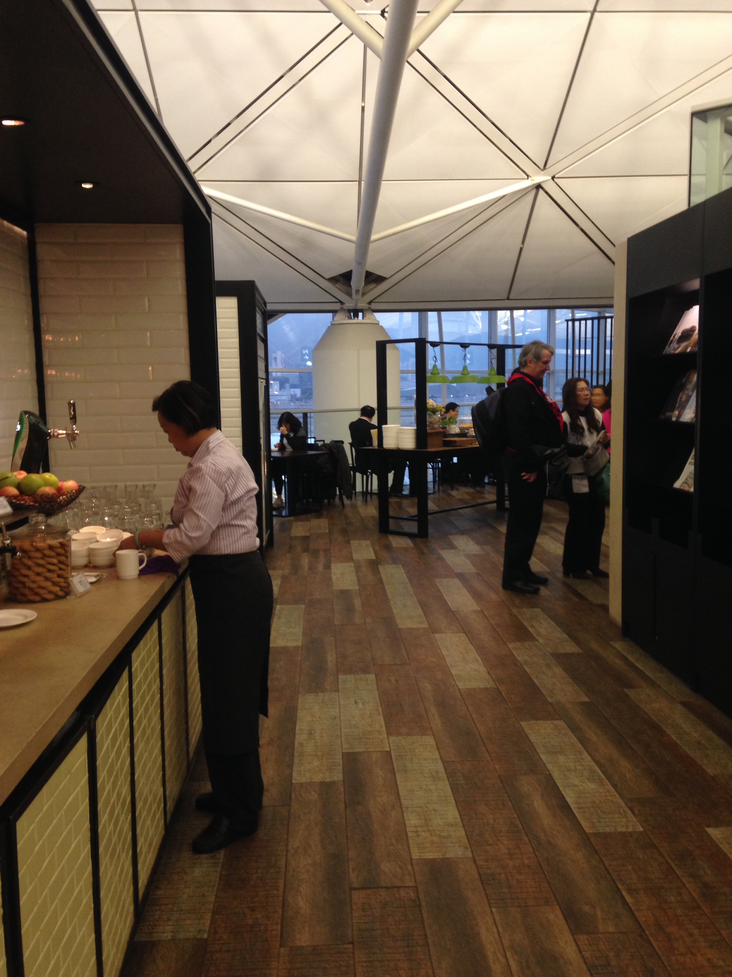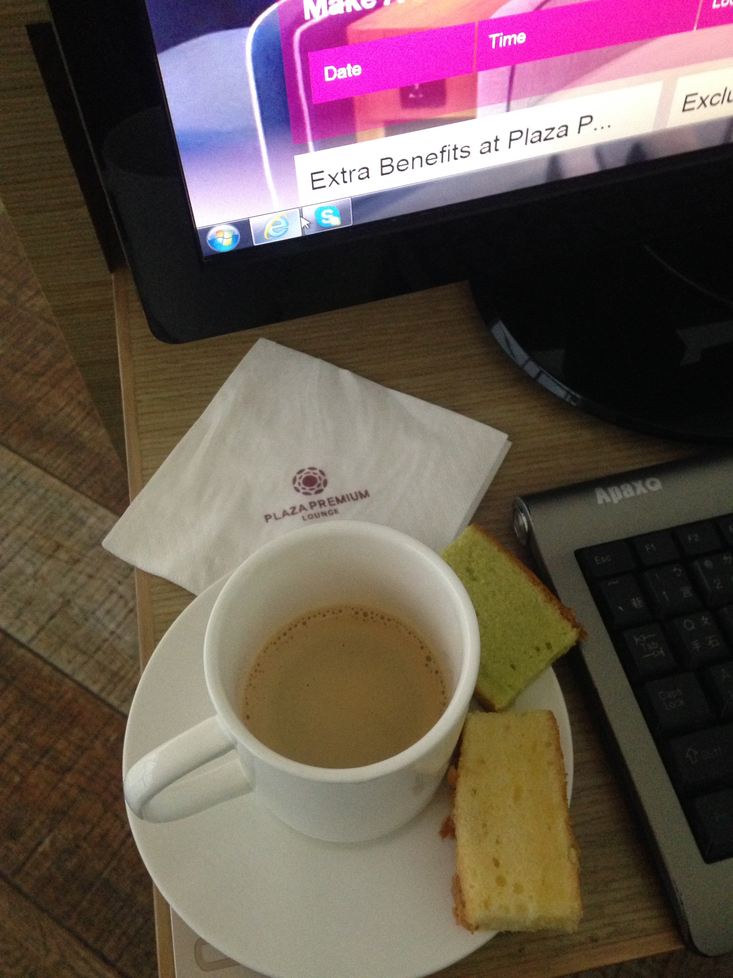 With nowhere to sit, I illegally bring a plate of food to a computer terminal where I secretly scoff down a few bits and pieces before going back for a coffee and some cake.
