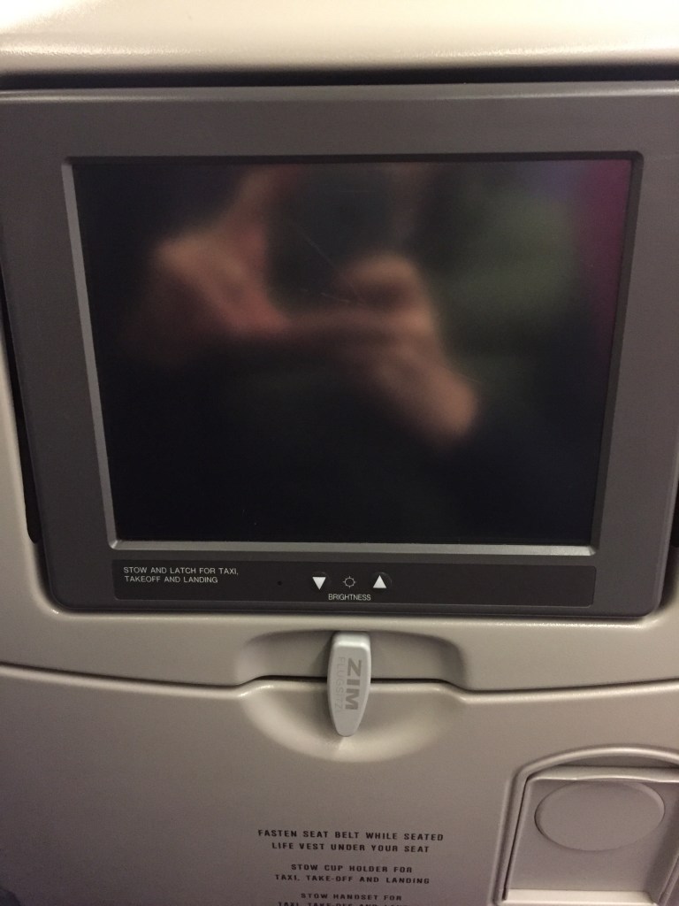 I am sitting in seat 34J in a 2-4-2 configuration on this Airbus A330-300 aircraft. It’s the old-style layout with the smaller squarish screen. Again, there are no USB ports which is annoying as my phone’s battery is half empty (or full…).
