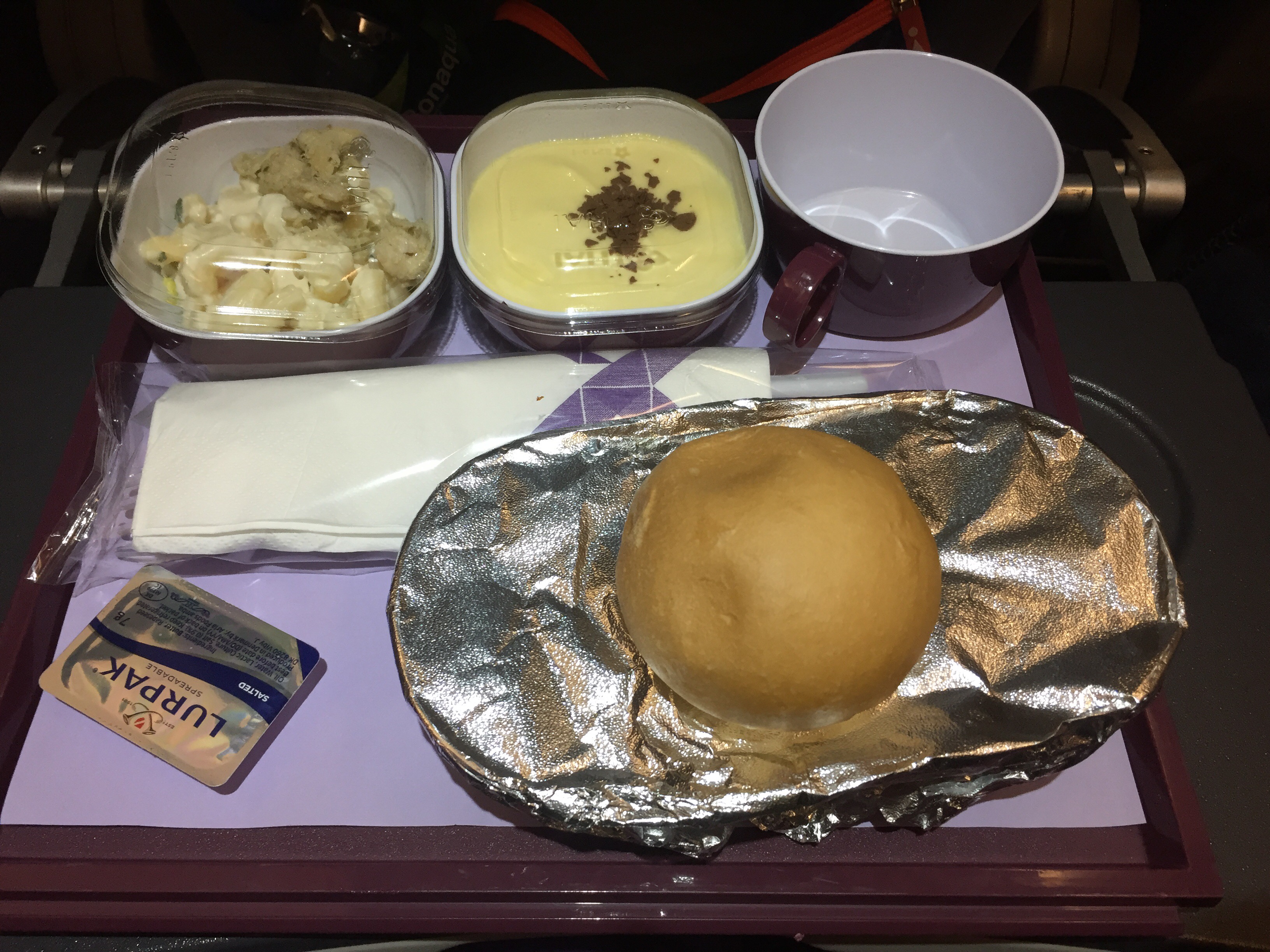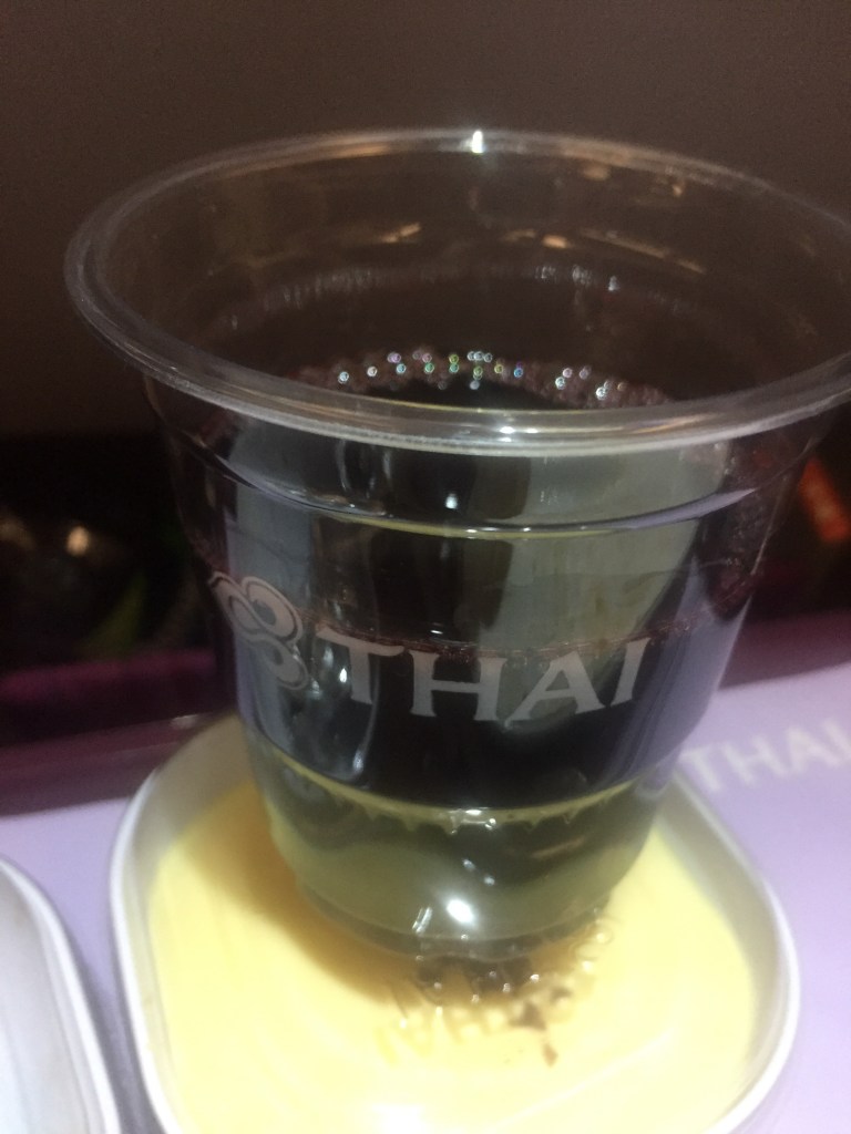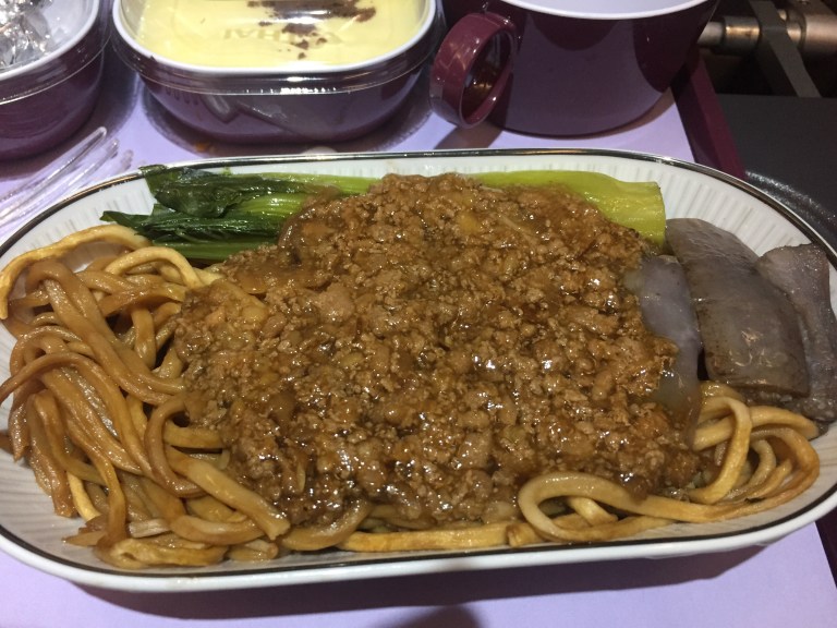 Dinner service is late by the time it reaches me. Although I am at the front end of Economy, it starts from the back on this flight. So I am one of the last to get my noodle dish, which incidentally is actually quite nice. A mango mousse follows with 2 glasses of red.