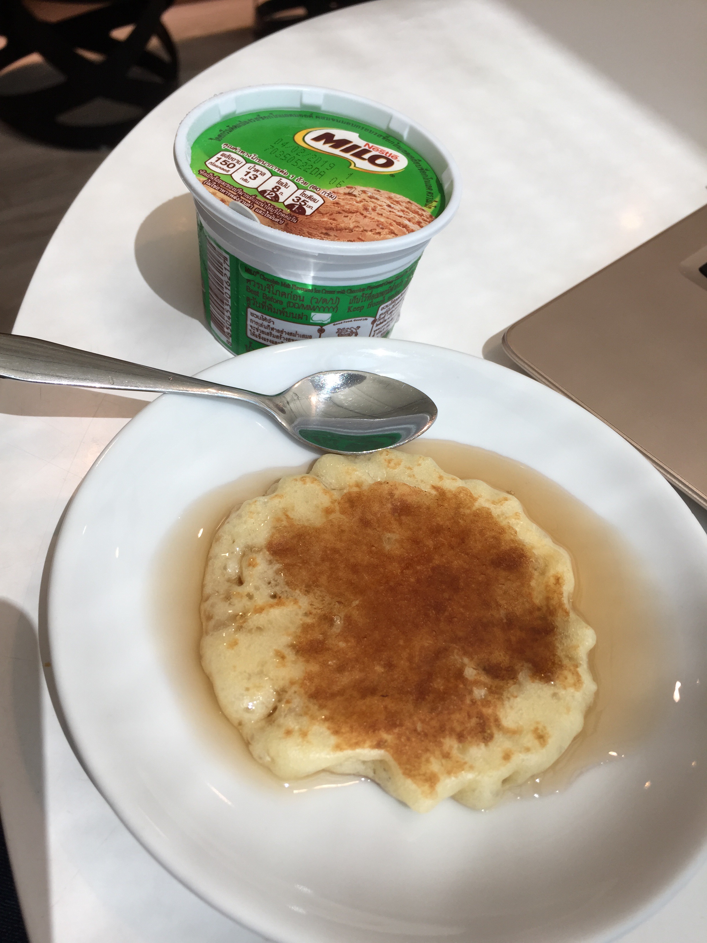 Not sure what the inflight service will be like so I stock up on brunch (at 10.30am). Salad, pastries, a mini pancake with maple syrup and ‘Milo’ ice-cream, and a coffee. I’ll be waddling on the plane…